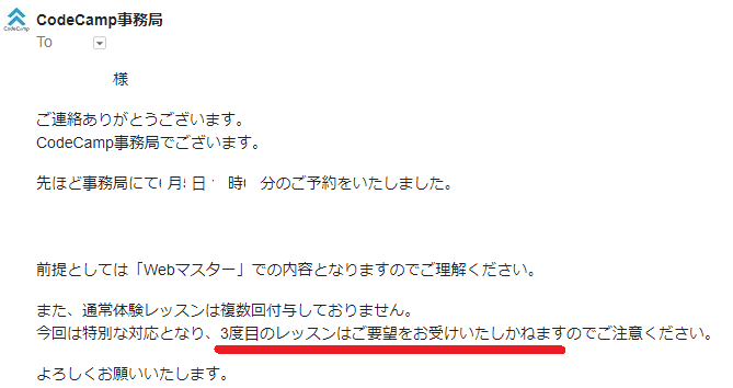 と思いながら、いざ無料体験レッスンへ。ちなみにコードキャンプは事前に電話連絡はなく、メールでのみの通知でした。