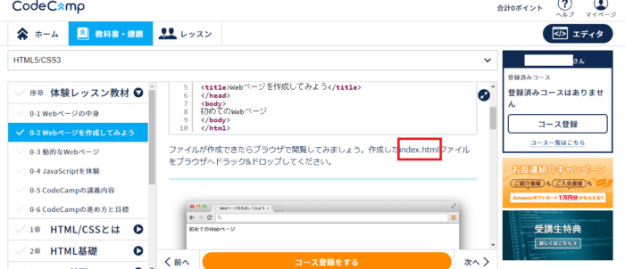 CodeCampも無料レッスンを申し込むと、オンラインで教科書を読むことができます。それがコチラ👇赤枠をごらんください。