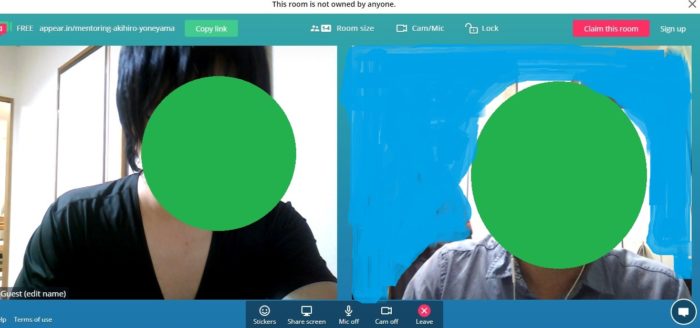 そして無料体験。「メンター」と呼ばれる現役のエンジニアさんとオンラインで話ができます。事前に聞きたい事を伝えておいたので、それについて答えてもらえました。※深夜を希望した為メンターさんは自宅から。左が僕。