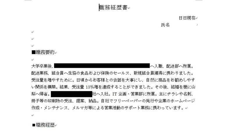 ちなみに以下が僕の職務経歴書です。※詳細は変えてありますが、こういった雰囲気の職務概要を書いたという事は伝わると思います。